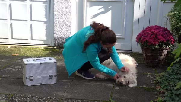 Das Tier rutscht auf dem Po, es besteht der Verdacht auf eine Erkrankung der Analdrüsen. Hier wird zusätzlich eine rektale Untersuchung durchgeführt. -
